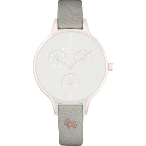 Grey leather with rose gold Radley Dog emblem near the top of the strap.