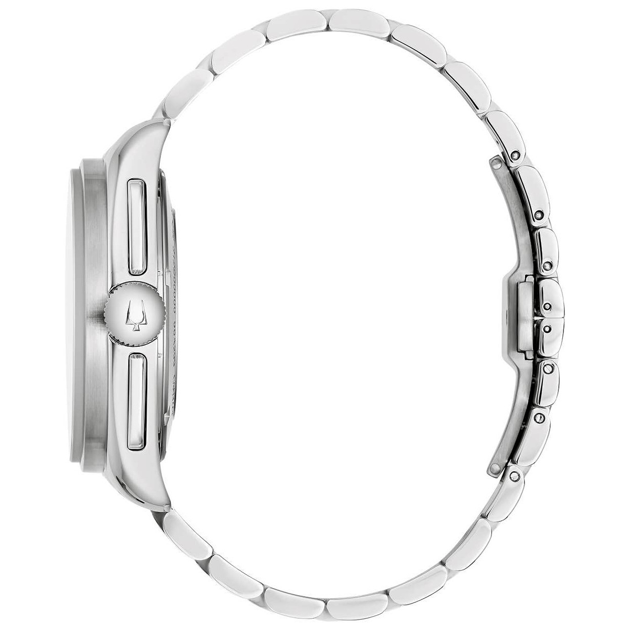- Slim chronograph pushers and a crown featuring the Bulova tuning fork logo are positioned at 3 o’clock.