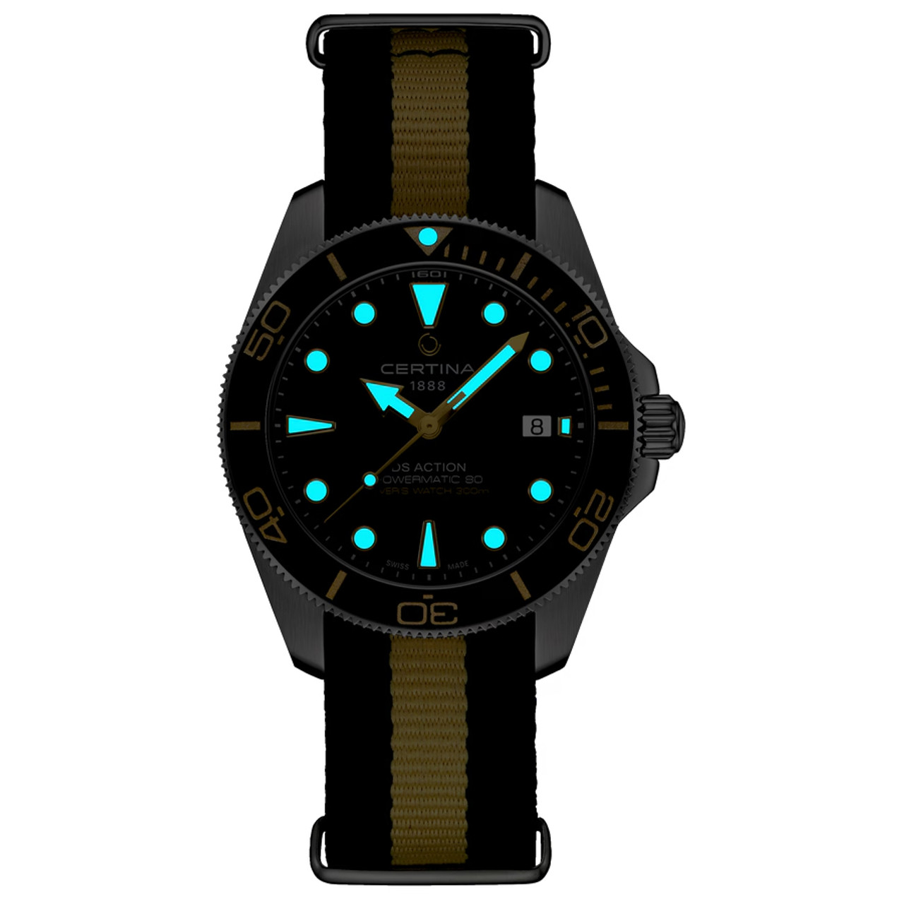 - The easy to read dial features Super luminova indexes and hands. In the dark, the SLN type BG W9 used by Certina emits the light stored as a blue shimmer.
