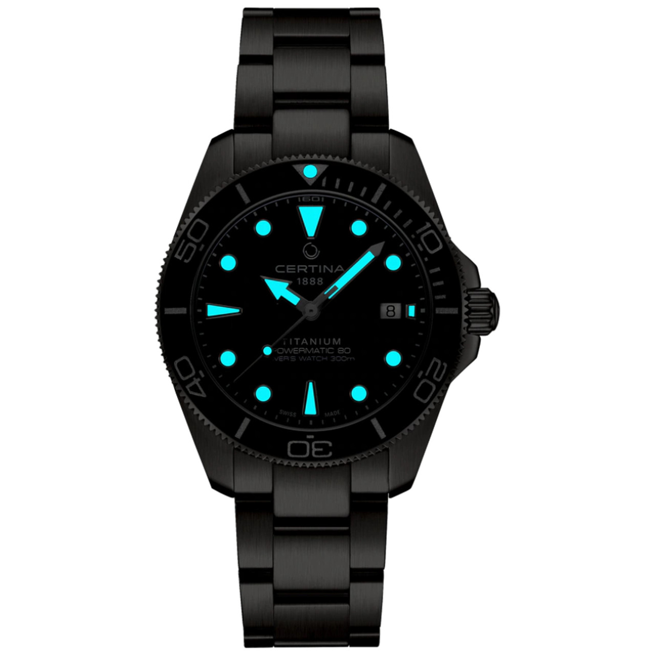 - The easy to read dial features Super luminova indexes and hands. In the dark, the SLN type BG W9 used by Certina emits the light stored as a blue shimmer.
