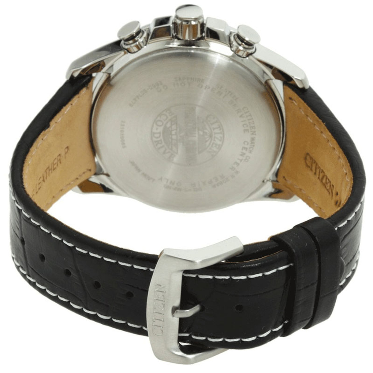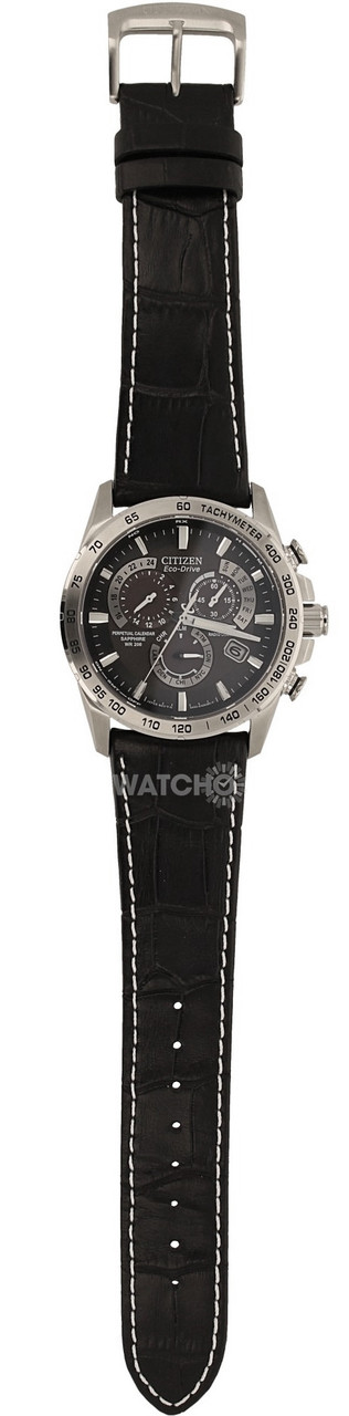 - Sporty looking feature-rich watch with contrast white stitches on black leather strap.