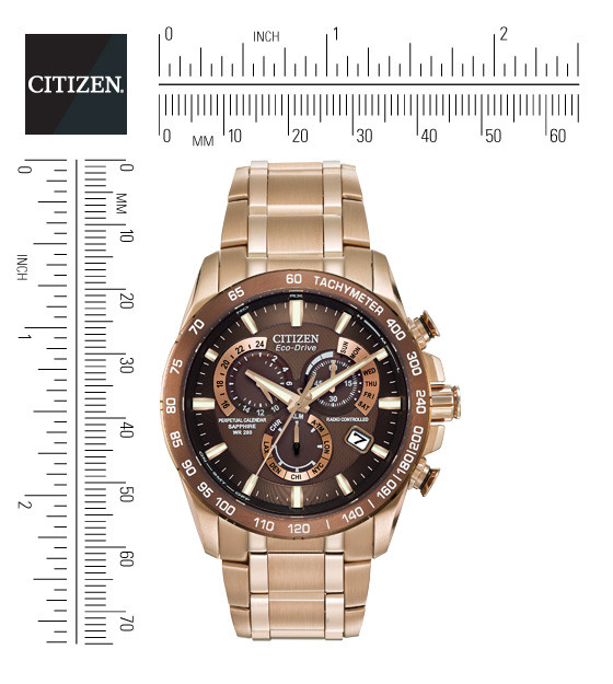 - Striking rose gold and bronze tone radio controlled watch with perpetual calendar.