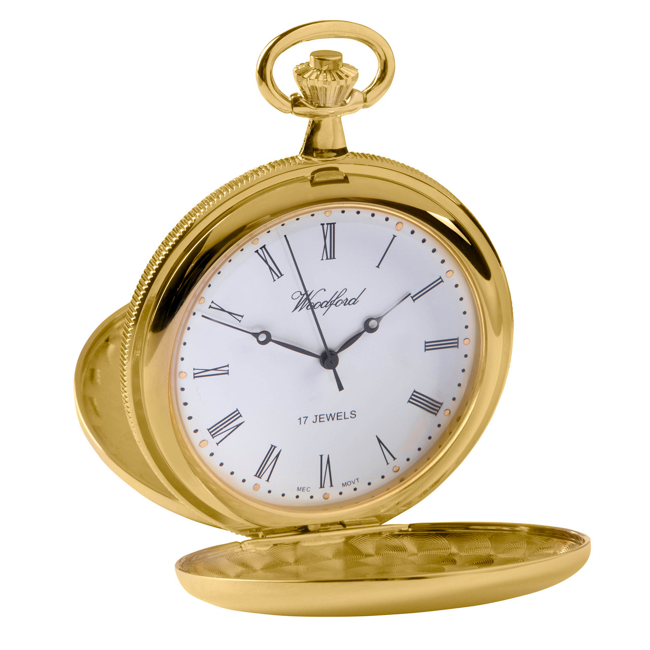 - Classic white dial with clear black roman numerals gold plated twin-lidded watch case with chain.